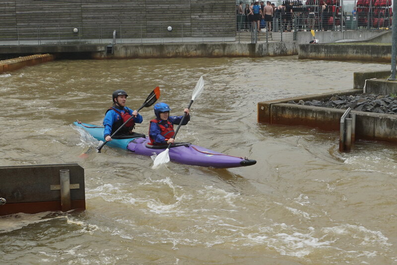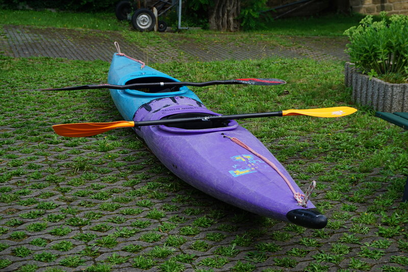 Nachdem letztendlich doch noch die richtigen Nieten im Internet bestellt werden konnten, wurden an allen Überlappungen zusätzliche Nietpunkte gesetzt. Diese wurden mit Epoxidharz verschlossen. Um die Belastbarkeit zu prüfen, wurde das Boot an beiden Enden aufgebockt und ein Paddlergewicht in die Mitte gestellt ... dabei bewegte sich nichts. Die Erwartungen sind hoch ...