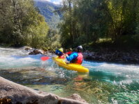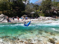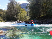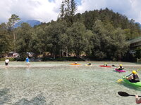 Woche 1 war wahrlich familiär in ungewohnt kleiner Gruppe. Aber so wurde selbst im Topoduo der Mindestabstand eingehalten und die sicher schwimmende Jugend an das doch etwas wildere Wasser herangeführt. Alle Kinder der Abteilung lernen zunächst sich im Flachwasser selbständig und möglichst sicher im Boot zu bewegen. In den Booten der Großen ist dies teils gar nicht so einfach, aber die 3 Kleinsten (aktuell im Alter von 6-9) machen sich ganz gut. Daher freuen wir uns umso mehr auf die Kinderausrüstung, für welche auf verschiedenen Ebenen eine Förderung beantragt wurde. Können die Kinder sicher Schwimmen und haben eine Körpergröße erreicht, bei welcher das Sicherheits-Material passt, so können auch die kleinsten bereits mit auf das wilde Element genommen werden. Dazu nutzen wir zunächst ein Wildwasserkajak für 2, in welchem ein erfahrener Paddler die Situation im Griff hat und die Kleinen (und auch manchmal Großen) Frischlinge das Wildwasser sicher kennen lernen können. Die Kleinen hatten somit Spaß im WW I-II im selbst gefahrenen Boot und auf bis zu WW III im Duo. Derweil konnten wir Großen uns auf einer Vielfalt von Strecken entlang der wunderschönen Soca einpaddeln, verbessern, an unsere Grenzen stoßen, diese durch gezieltes Training überwinden und einfach Spaß am gemeinsamen Sport haben.