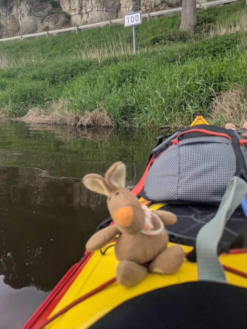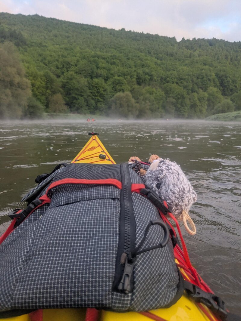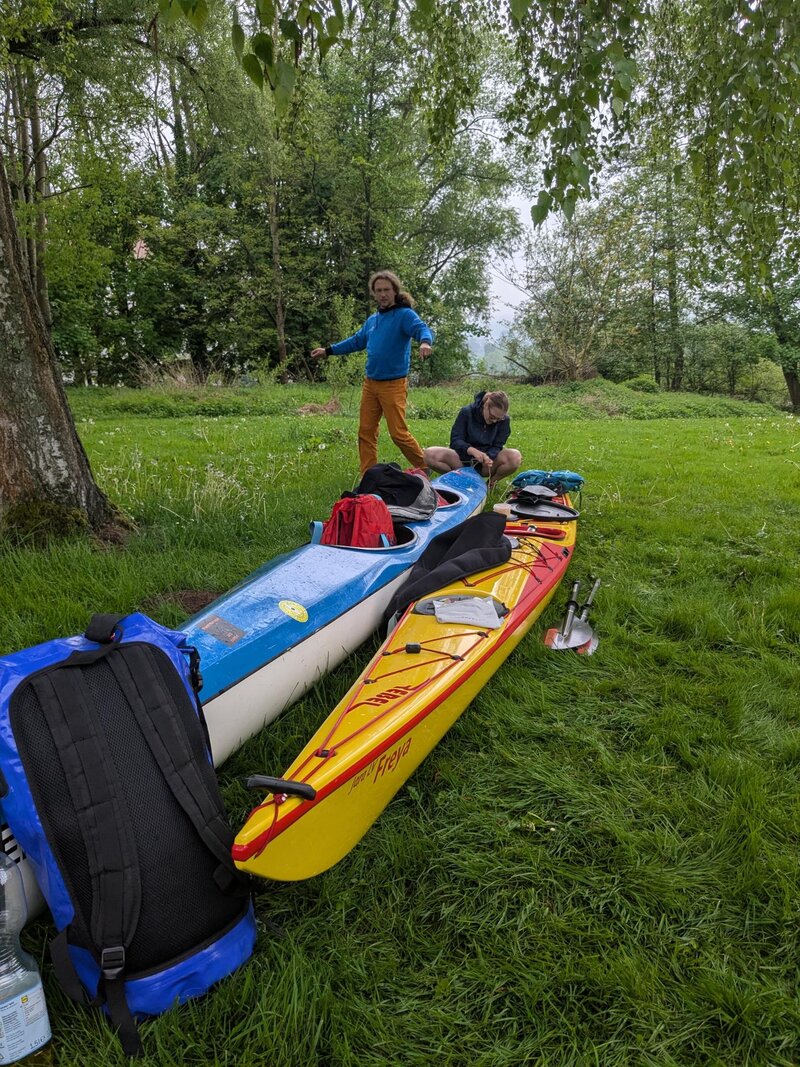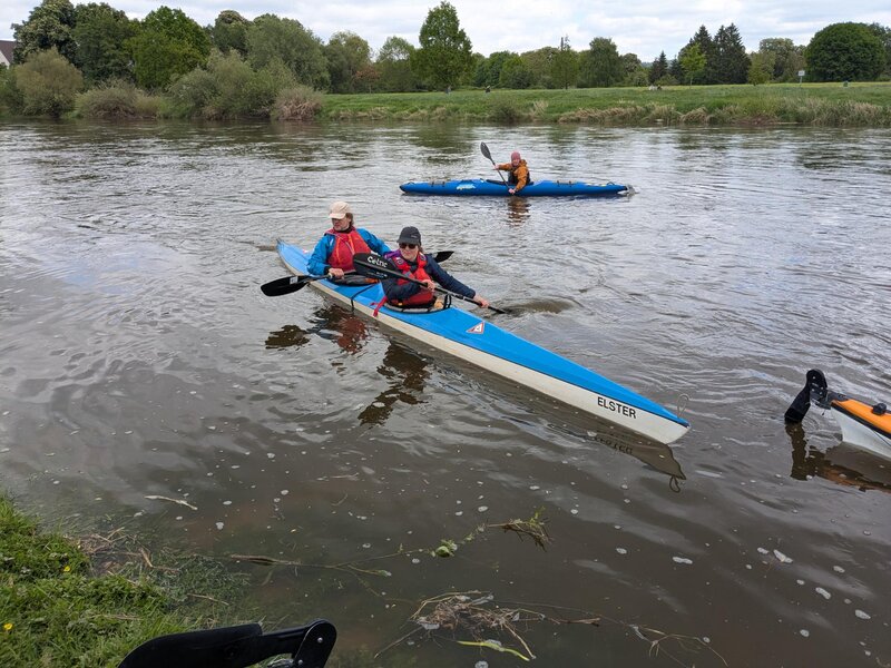 Die Anreise und das Zeltaufbauen verliefen entspannt. Nachdem das Auto für den Rücktransport umgesetzt war, nutzten wir die Zeit für einen kleinen Ortsrundgang – bis uns der Regen ins Trockene vertrieb. Am Abend stärkten wir uns mit Pizza und krochen zeitig in unsere Zelte, um fit für den langen Paddeltag zu sein. Am Sonntagmorgen hieß es um 6 Uhr: Boote beladen, anstellen und ab auf die Weser! Schon die ersten Kilometer verlangten einiges ab, da ein unangenehmer Gegenwind die Paddelarbeit deutlich erschwerte. Dennoch meisterte das Team im Zweier gemeinsam mit dem Seekajak die ersten 55 km und belohnte sich in der Pause mit Kaffee und Kuchen. Nach weiteren 15 km entschieden die beiden im Zweier, bei der Silberstrecke auszusteigen. Dank freundlicher Mitpaddler fanden sich spontan Helfer, die uns samt der „Elster“ im Bus bis zum Ziel mitnahmen. Dort warteten Currywurst, Pommes, Kuchen, Bier, Kaffee – und viele nette Gespräche. Unser Seekajak kämpfte sich währenddessen tapfer bis zum Schluss durch den Wind und wurde am Ziel unter lautem Jubel empfangen. Nachdem alle Boote verladen waren, traten wir erschöpft, aber glücklich die Heimreise an.