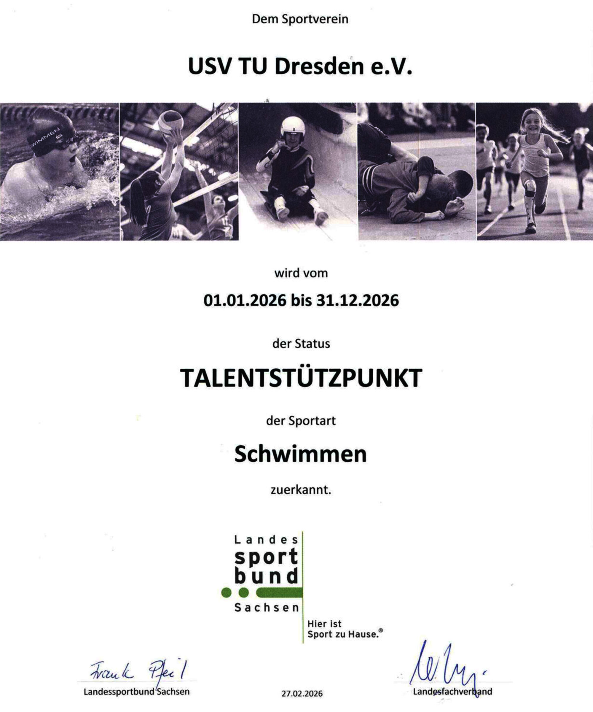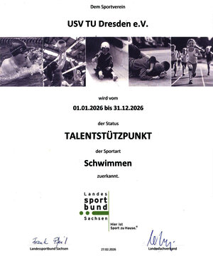 Der Abteilung Schwimmen des USV TU Dresden e. V. wurde für das Jahr 2026 wiederum der Status Talentstützpunkt vom Landessportbund Sachsen zuerkannt!