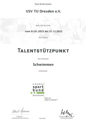 Der Abteilung Schwimmen des USV TU Dresden e. V. wurde für das Jahr 2025 wiederum der Status Talentstützpunkt vom Landessportbund Sachsen zuerkannt!
