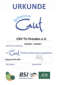 Anfang April wurde die Abteilung Schwimmen im USV TU Dresden e.V. das Zertifikat „SchwimmGut“ – Zertifizierte Schwimmschule“ für 2 weitere Jahre bestätigt.